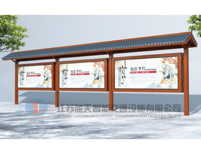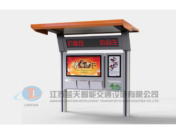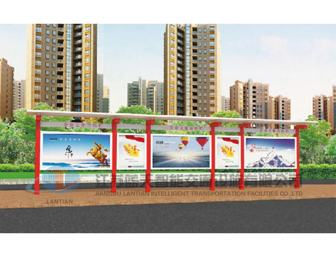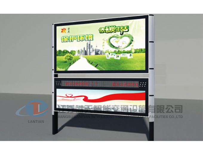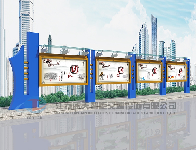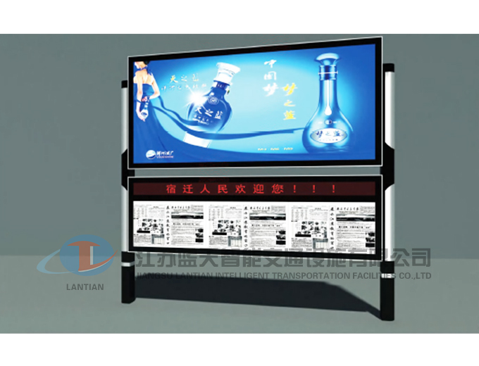 江苏蓝天智能交通设施有限公司是一家生产宣传栏,候车亭,公交站台,阅报栏,指路牌,广告垃圾箱,滚动换画灯箱等系列产品厂家!产品多达上百种,亦可根据客户的需求加工制作各种型号、规格的产品。目前已经成功的向市场推出装备有太阳能的各类产品,紧跟国家倡导“节能低碳”的环保政策。